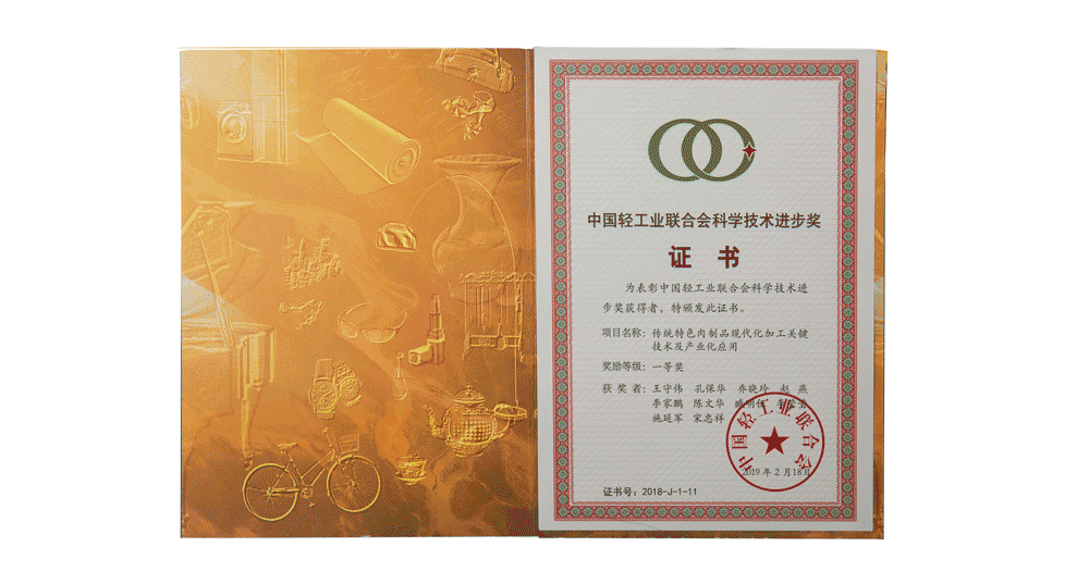日前,中國輕工業(yè)聯(lián)合會對2018年度在科技發(fā)明及技術(shù)創(chuàng)新方面表現(xiàn)突出的企業(yè)及項目進行了表彰,由金字參與的“傳統(tǒng)特色肉制品現(xiàn)代化加工關(guān)鍵技術(shù)及產(chǎn)業(yè)化應(yīng)用”項目經(jīng)審定及批準,喜獲中國輕工業(yè)聯(lián)合會科技進步獎一等獎。