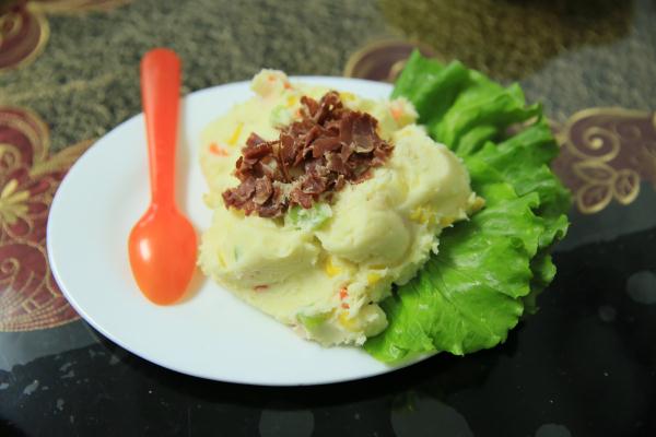 點(diǎn)評(píng):土豆泥很細(xì)膩,加入了玉米、黃瓜和胡蘿卜之后,不光色彩搶眼,而且營(yíng)養(yǎng)豐富。火腿和沙拉醬的組合,更是讓整道菜帶點(diǎn)淡淡的甜和淡淡的咸鮮,又奶香味十足,非常適合老人孩子食用。
