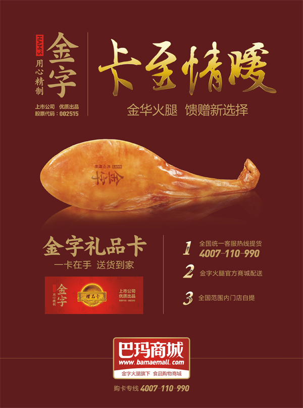 作為一家上市公司——金字火腿推出的禮品卡,禮品卡多年信譽,廣受消費者的真心歡迎,每年回頭客無數(shù),而更重要的是,金字每年把產(chǎn)品的品質(zhì)和備貨做到更好,禮品卡內(nèi)產(chǎn)品都是公司層層品質(zhì)歷練的熱銷產(chǎn)品,用火腿、臘肉、香腸這些實在心意,去感動每一位朋友。如今,更是可以通過手機微信關注金字火腿,盡享中華美食同時,與朋友分享禮品卡里所蘊含的真情實意。