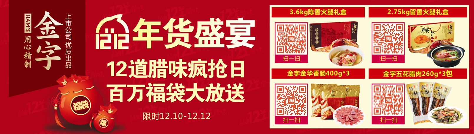 2015呼之欲來,在2014的年末,金字火腿以“12道臘味”致敬你過去1年的辛勞。12月12日,在金字火腿天貓旗艦店,最經(jīng)典的12款寶貝價格最低2折起,滿318元就送百元福袋(內(nèi)含2包45g肉棗、2包40g火腿片、1張肉票、1份利是封),還可參加抽大獎活動,屆時將會抽取2名價值不菲的巴瑪火腿大獎和24名價值500元的12道臘味大獎。